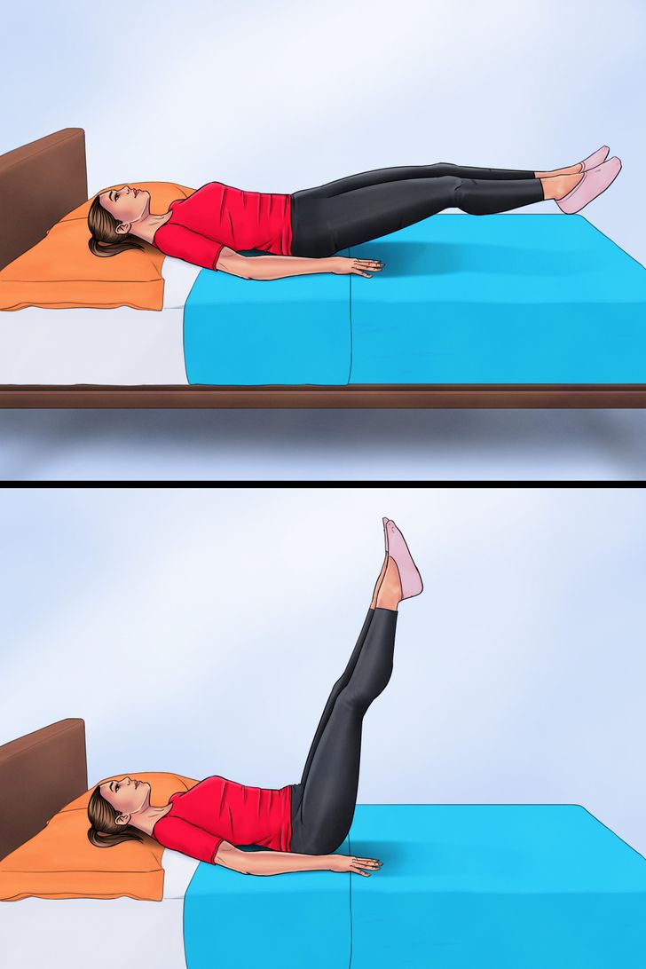 Sırt üstü yatın, bacaklarınızı kaldırın ve yavaşça indirin. Her iki bacak için tekrarlayın.